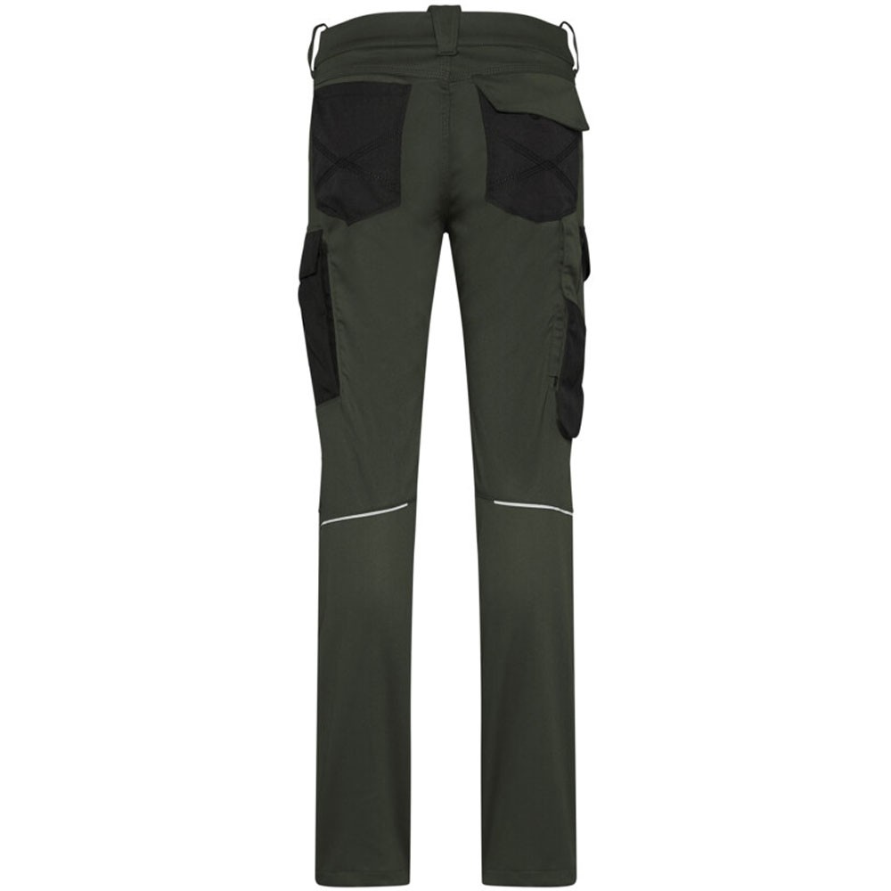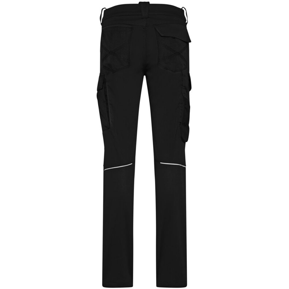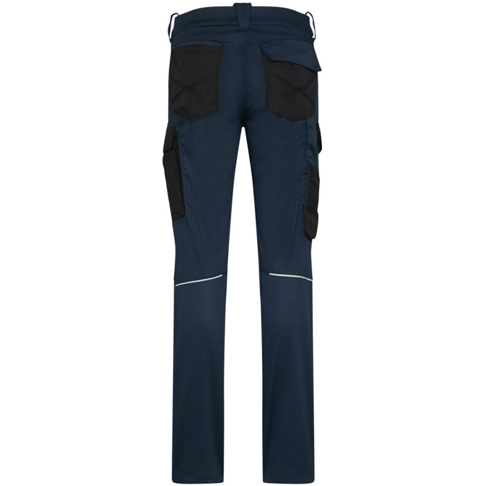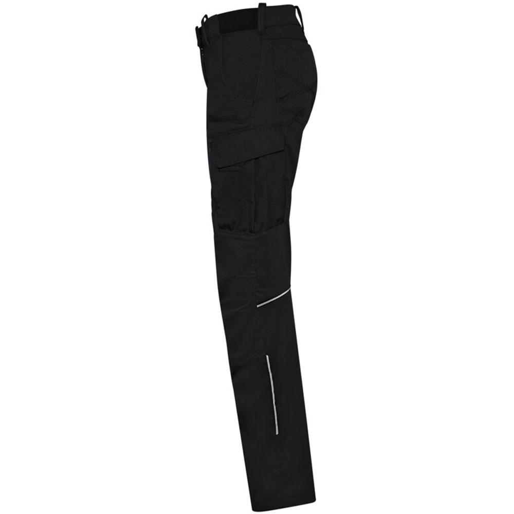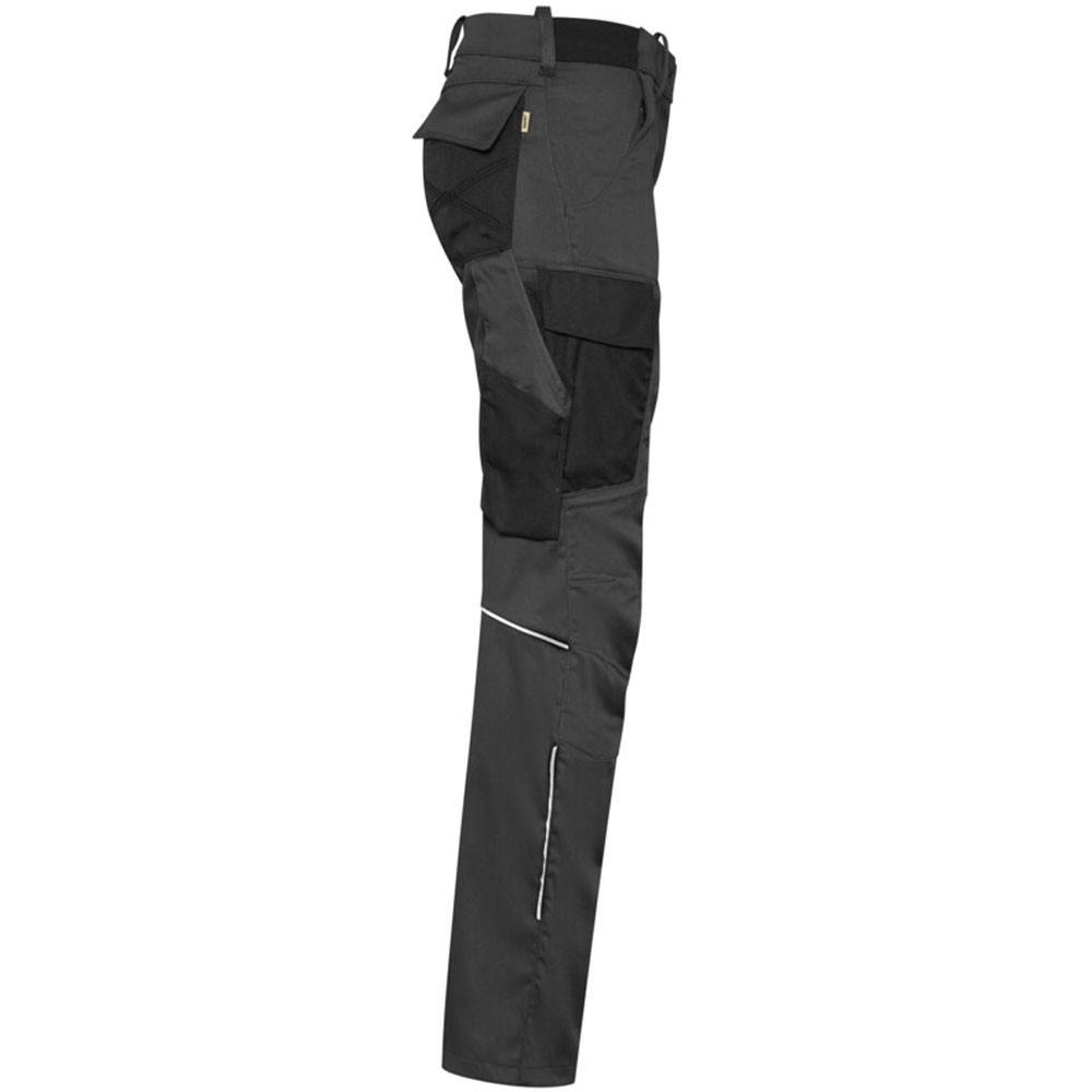 Extrem strapazierfähige und funktionelle Hose mit dehnbarem Hosenbund durch robuste Strickeinsätze an den Seiten. Sicherheitsknopf, Reissverschluss, Gürtelschlaufen, eingenähte Reflexbänder und ergonomisch vorgeformte Passform. Zwei Einschubtaschen, rechts mit zusätzlicher Sicherheits-Reissverschlusstasche. Zwei Gesässtaschen mit Stickerei, rechts mit Patte und Klettverschluss. Zwei Cargotaschen mit multifunktionellen Unterteilungen, verschliessbar mit Patten und Reissverschluss an der linken Cargotasche. Aufgesetzte Zollstocktasche auf der rechten Seite. Alle aufgesetzten Taschen aus CORDURA® und alle Reissverschlüsse von YKK®. Besonders strapazierfähiger Materialmix aus Baumwolle, GRS-zertifiziertem, recyceltem Polyester und Elasthan. Verfügbar auch als Unisexmodell.