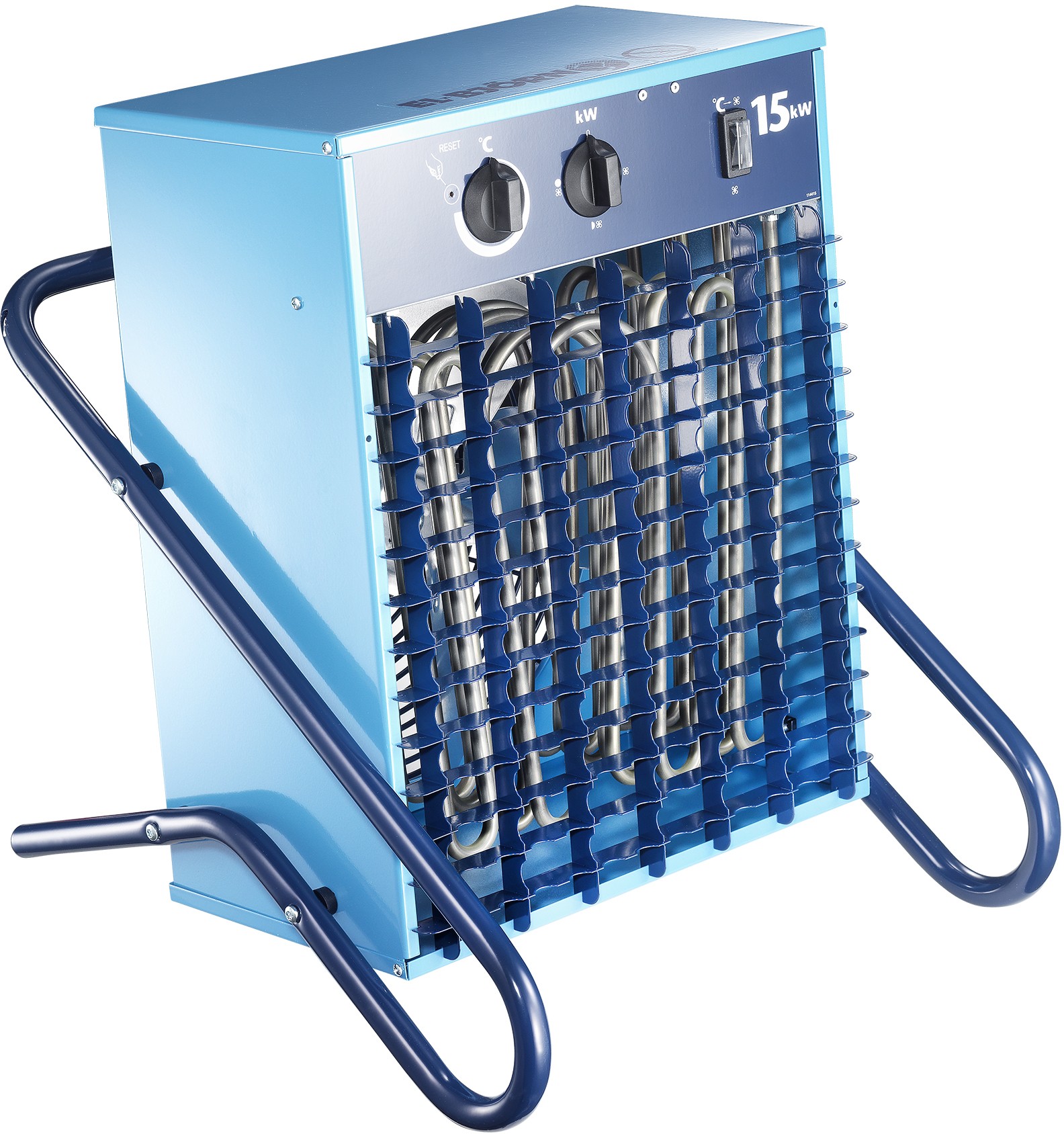 - Robuste Heizlüfter aus blaulackiertem, korrosionsbeständigem verzinktem Stahlblech