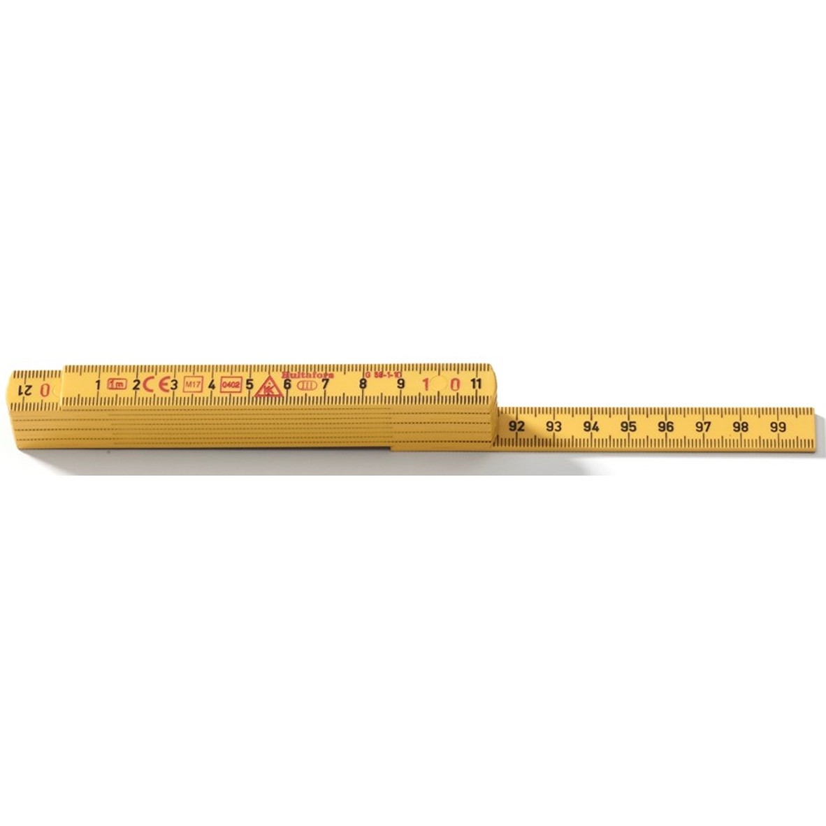 Gliedermassstab aus glasfaserverstärktem Polyamid für erhöhte Widerstandskraft gegen Feuchtigkeit. Beidseitige Millimetereinteilung in schwarz mit roter Dezimeterbezifferung.