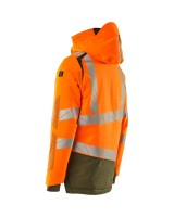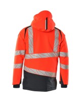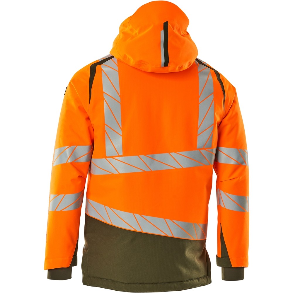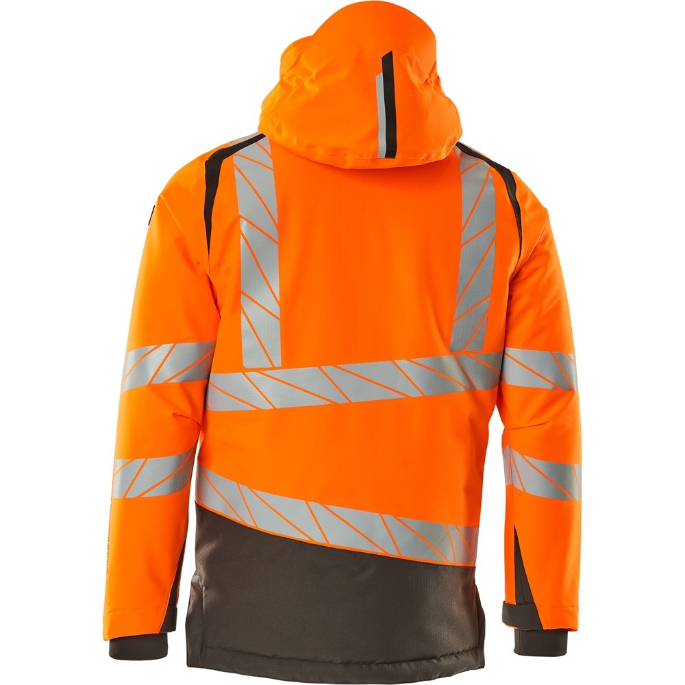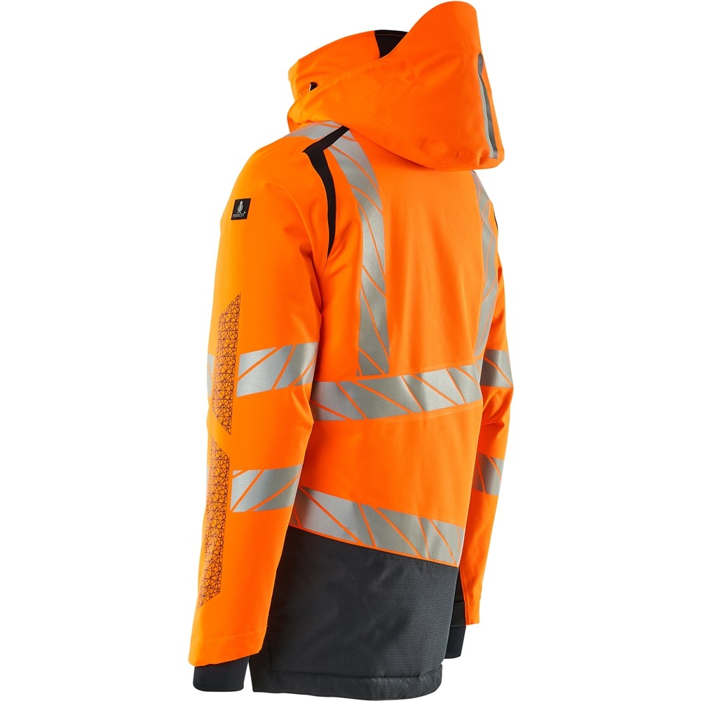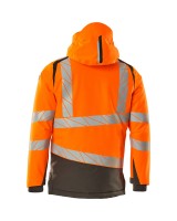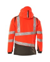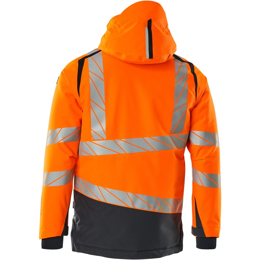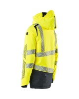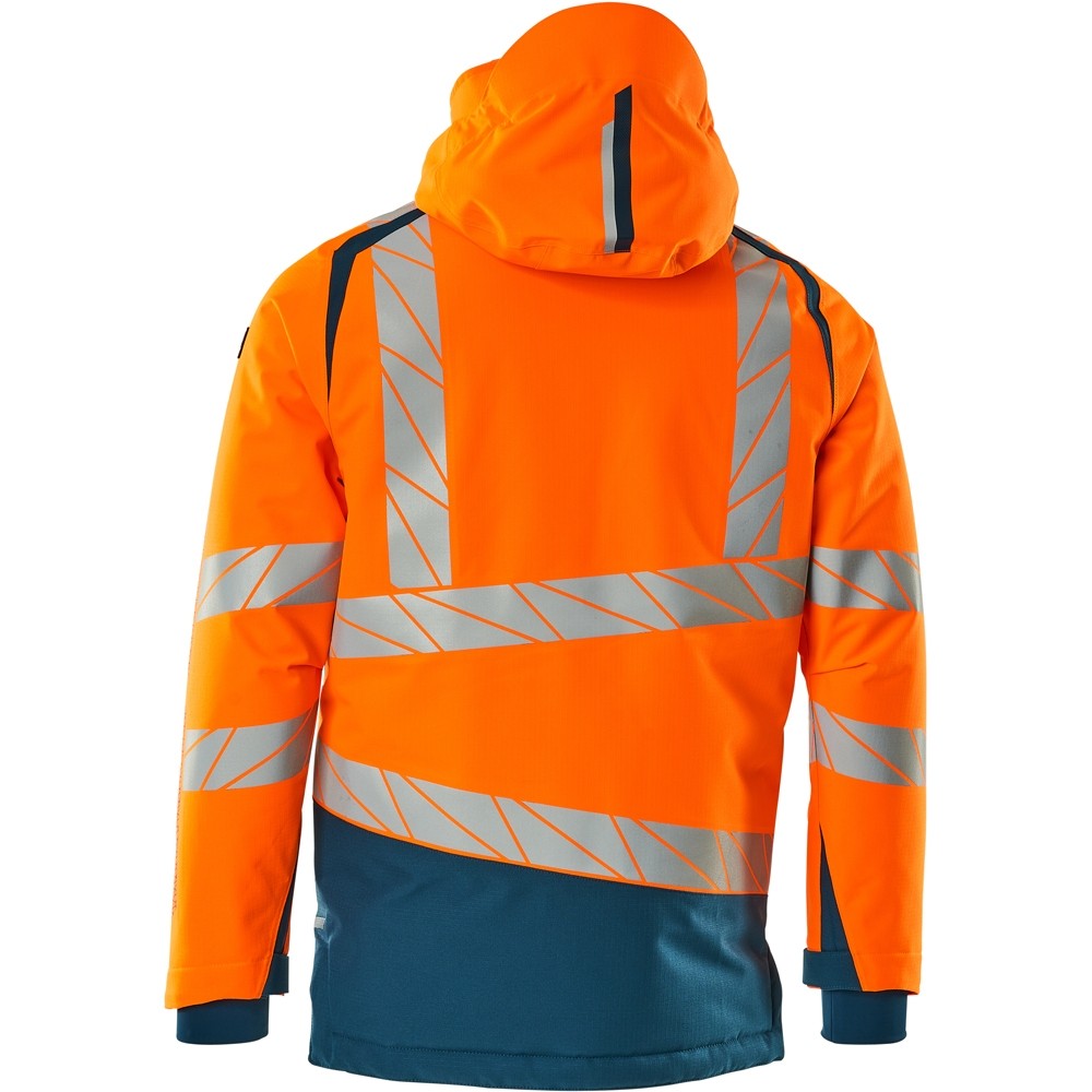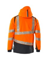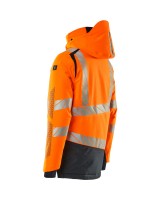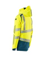Fluoreszierend und mit Reflexschulterstreifen sowie schrägverlaufenden Reflexen. Hoch strapazierfähiger, atmungsaktiver, wind- und wasserdichter Stoff. Mit CLIMASCOT® Lightweight Insulation. Zweifarbig. Nähte sind verklebt. Kapuze ist abnehmbar, gefüttert und mit verstellbaren Elastikschnüren versehen. Verschluss mit wasserdichtem Reissverschluss und inwendiger Wetterschutzleiste. Innentaschen - zwei mit Reissverschluss sowie eine offene aus Netzmaterial. ID-Kartenhalter ist abnehmbar. Brusttasche mit wasserdichtem Reissverschluss. Vordertaschen mit wasserdichten Reissverschlüssen. Stehkragen. Vorne in der Jacke Rippenbund an der Unterkante innen. Verlängerter Rücken durch herunter knöpfbaren Stoff zum besseren Schutz vor Wind und Wetter. Rippenbündchen (verdeckt unter der Wetterschutzleiste) an den Handgelenken. Klettverschluss an den Handgelenken. Reissverschluss im Futter am Rücken zum Anbringen eines Logos/einer Stickerei. Druckeffekten.