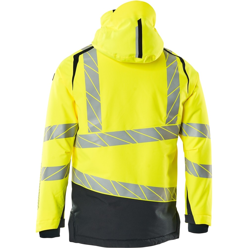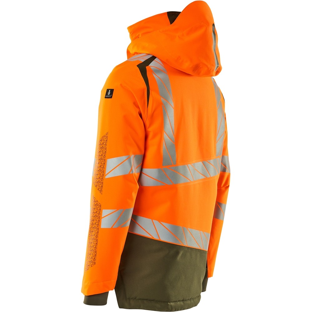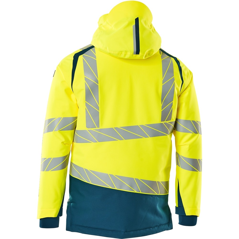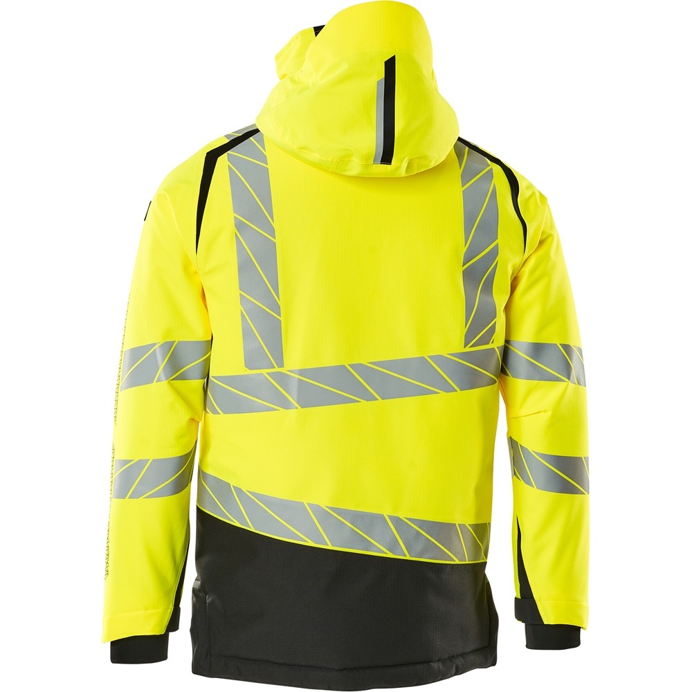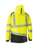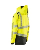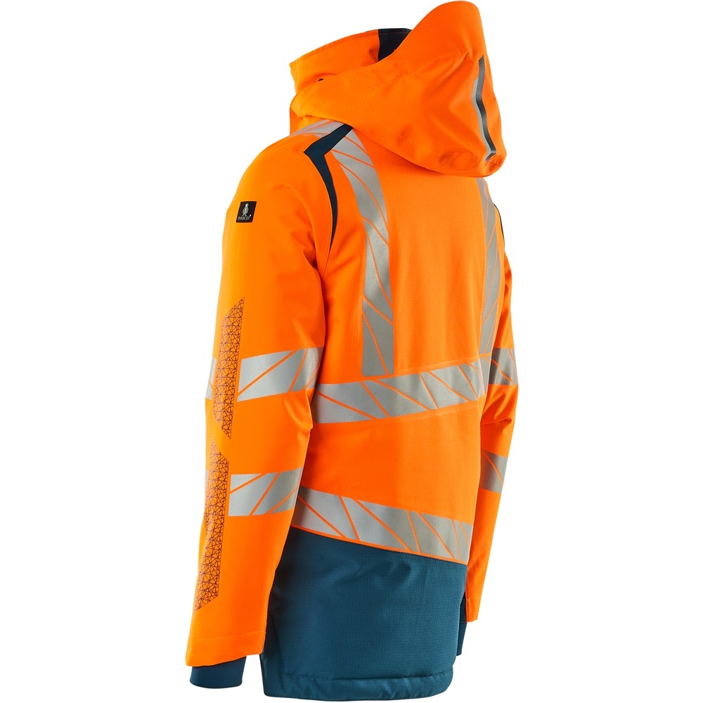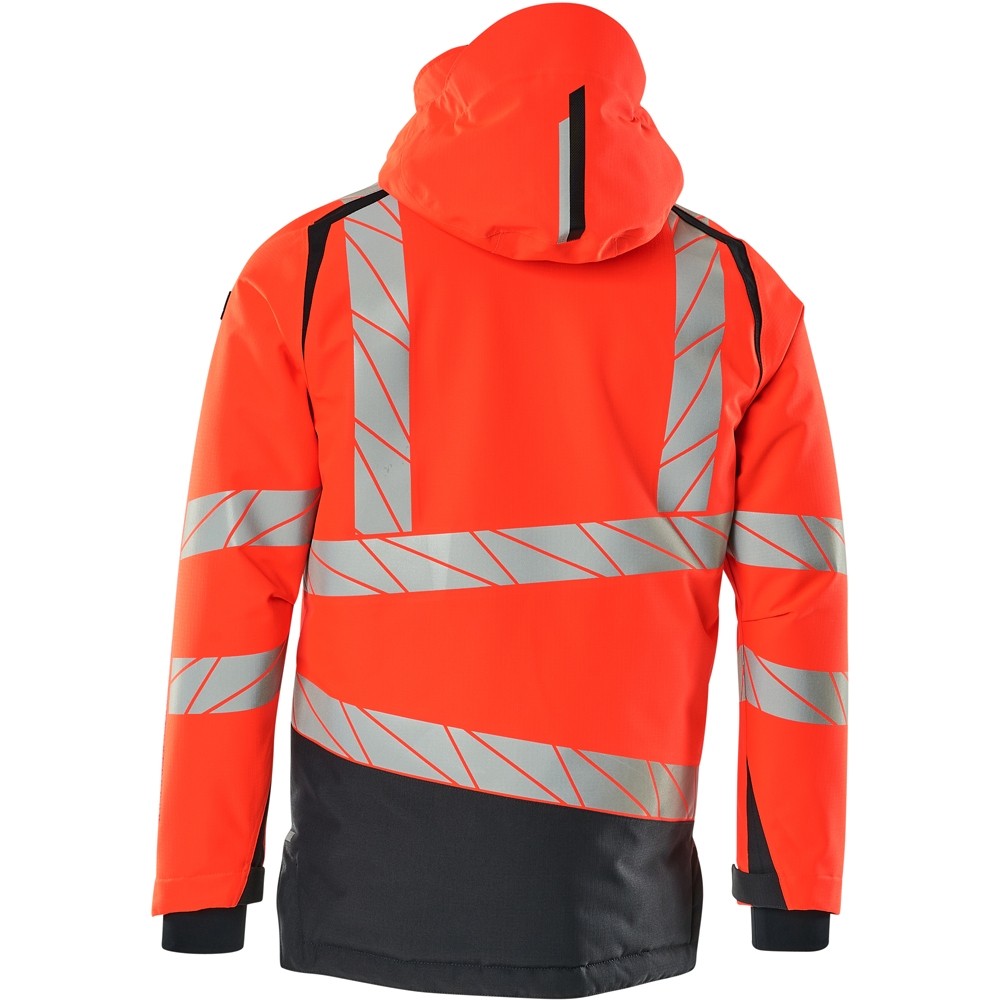 Fluoreszierend und mit Reflexschulterstreifen sowie schrägverlaufenden Reflexen. Hoch strapazierfähiger, atmungsaktiver, wind- und wasserdichter Stoff. Mit CLIMASCOT® Lightweight Insulation. Zweifarbig. Nähte sind verklebt. Kapuze ist abnehmbar, gefüttert und mit verstellbaren Elastikschnüren versehen. Verschluss mit wasserdichtem Reissverschluss und inwendiger Wetterschutzleiste. Innentaschen - zwei mit Reissverschluss sowie eine offene aus Netzmaterial. ID-Kartenhalter ist abnehmbar. Brusttasche mit wasserdichtem Reissverschluss. Vordertaschen mit wasserdichten Reissverschlüssen. Stehkragen. Vorne in der Jacke Rippenbund an der Unterkante innen. Verlängerter Rücken durch herunter knöpfbaren Stoff zum besseren Schutz vor Wind und Wetter. Rippenbündchen (verdeckt unter der Wetterschutzleiste) an den Handgelenken. Klettverschluss an den Handgelenken. Reissverschluss im Futter am Rücken zum Anbringen eines Logos/einer Stickerei. Druckeffekten.