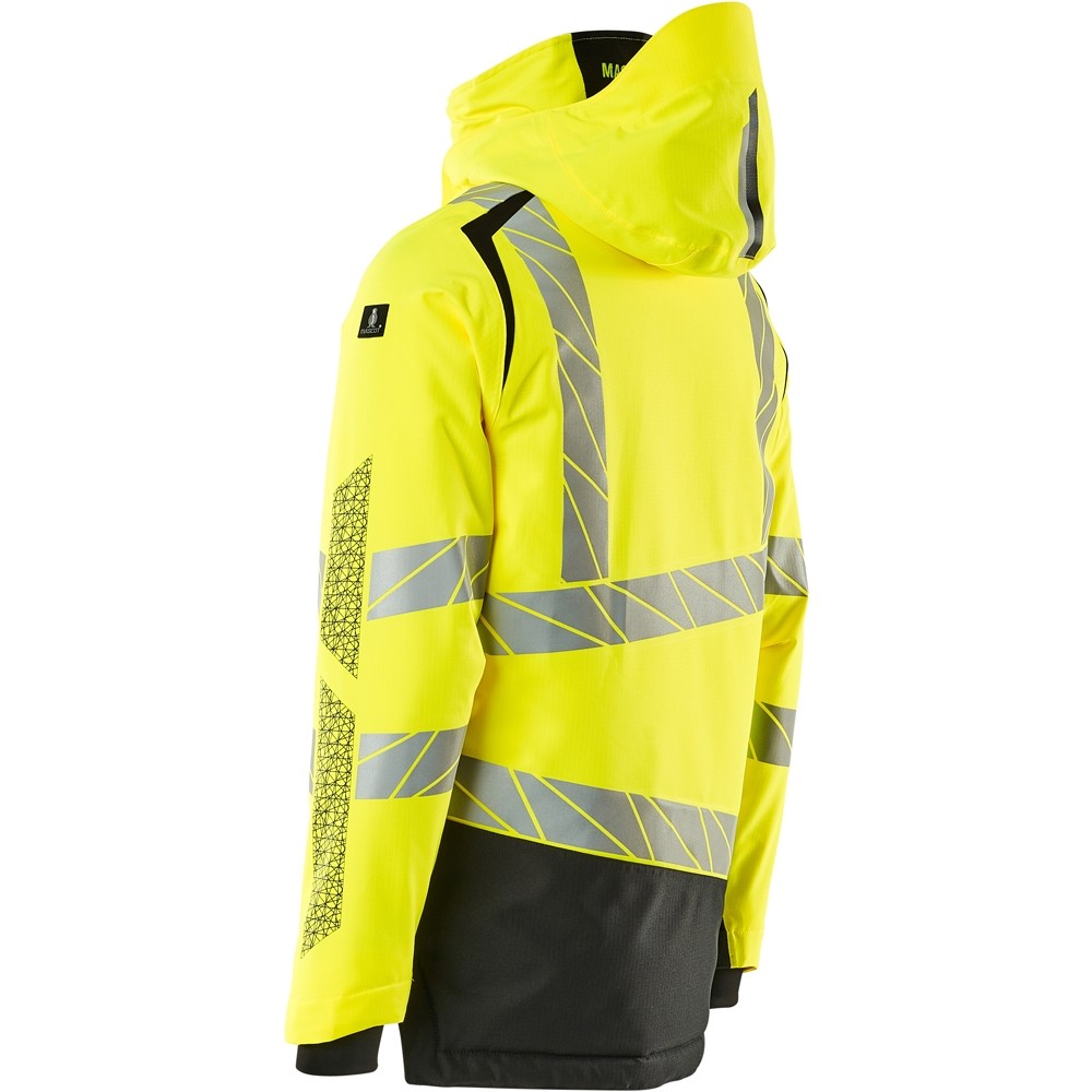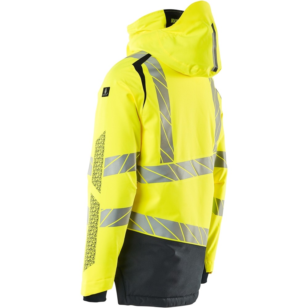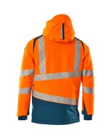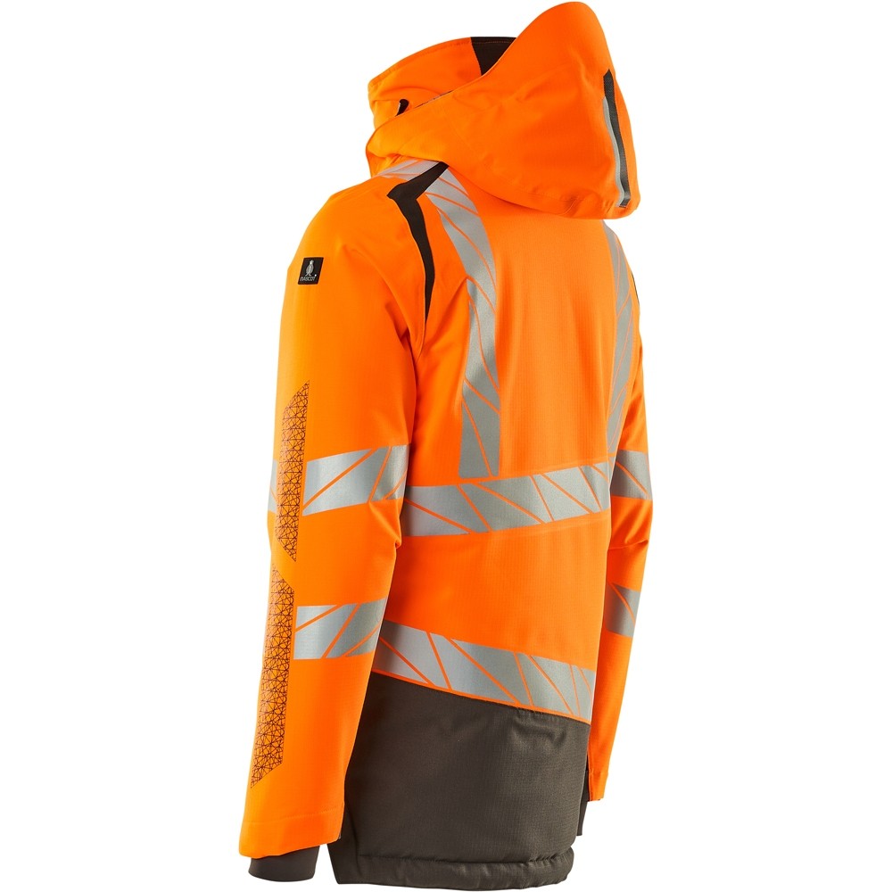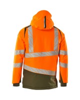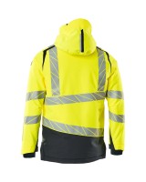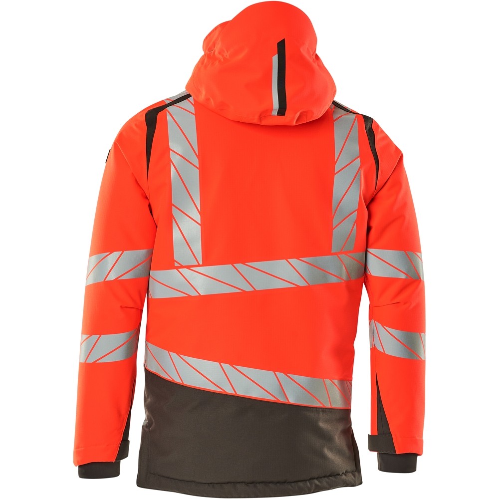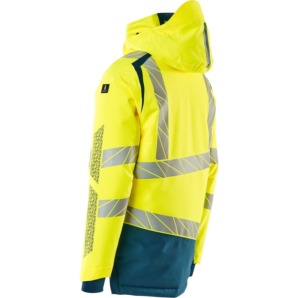 Fluoreszierend und mit Reflexschulterstreifen sowie schrägverlaufenden Reflexen. Hoch strapazierfähiger, atmungsaktiver, wind- und wasserdichter Stoff. Mit CLIMASCOT® Lightweight Insulation. Zweifarbig. Nähte sind verklebt. Kapuze ist abnehmbar, gefüttert und mit verstellbaren Elastikschnüren versehen. Verschluss mit wasserdichtem Reissverschluss und inwendiger Wetterschutzleiste. Innentaschen - zwei mit Reissverschluss sowie eine offene aus Netzmaterial. ID-Kartenhalter ist abnehmbar. Brusttasche mit wasserdichtem Reissverschluss. Vordertaschen mit wasserdichten Reissverschlüssen. Stehkragen. Vorne in der Jacke Rippenbund an der Unterkante innen. Verlängerter Rücken durch herunter knöpfbaren Stoff zum besseren Schutz vor Wind und Wetter. Rippenbündchen (verdeckt unter der Wetterschutzleiste) an den Handgelenken. Klettverschluss an den Handgelenken. Reissverschluss im Futter am Rücken zum Anbringen eines Logos/einer Stickerei. Druckeffekten.