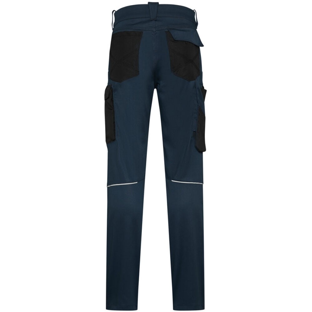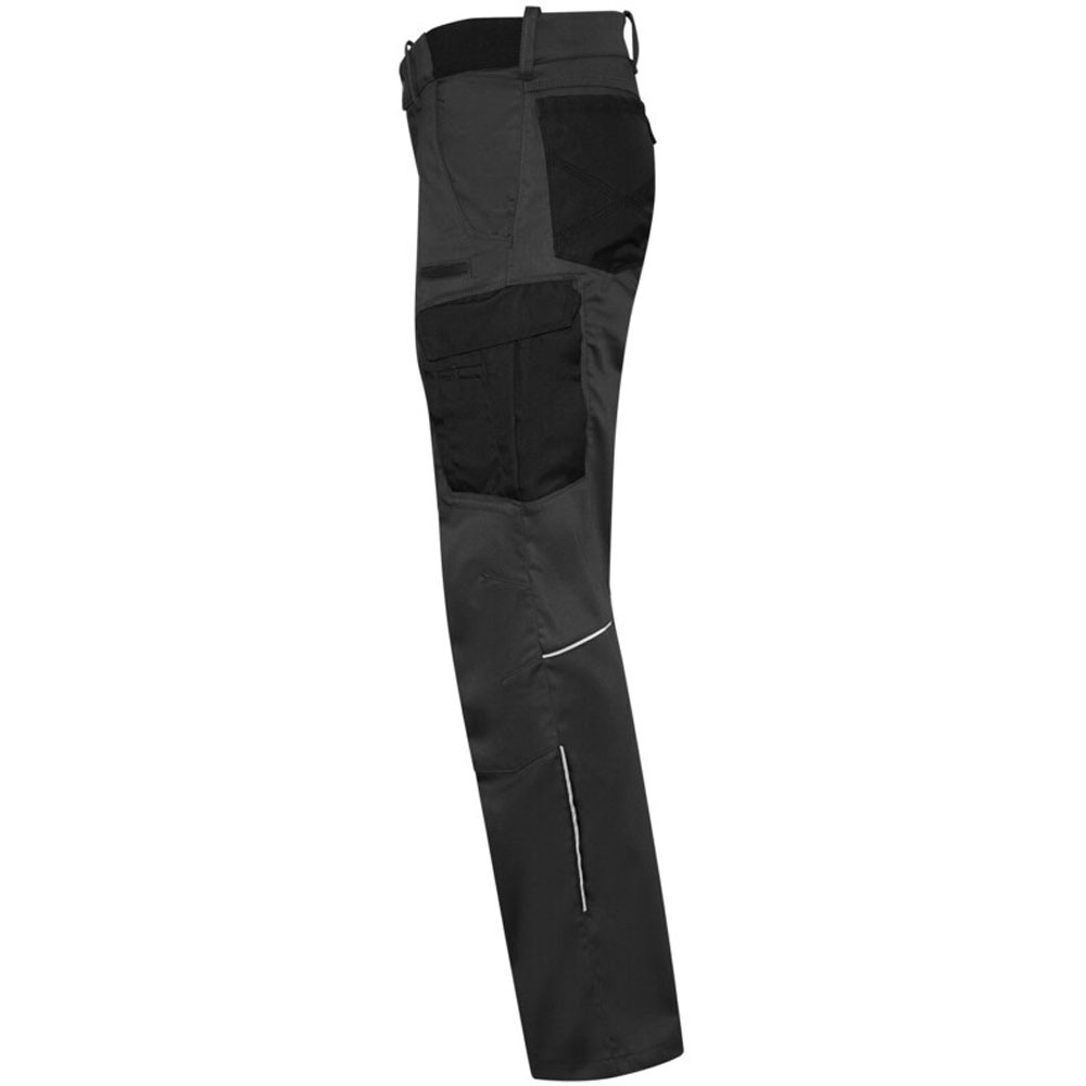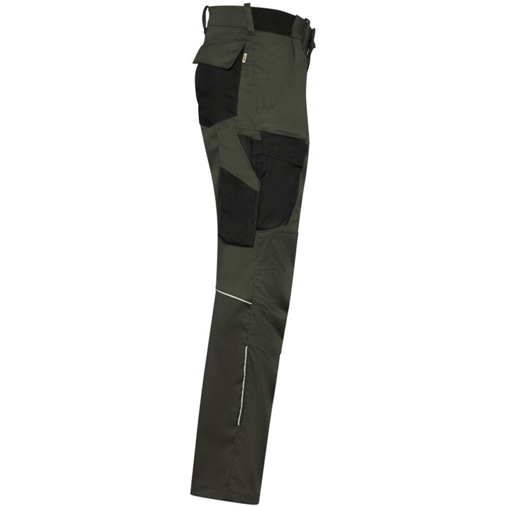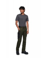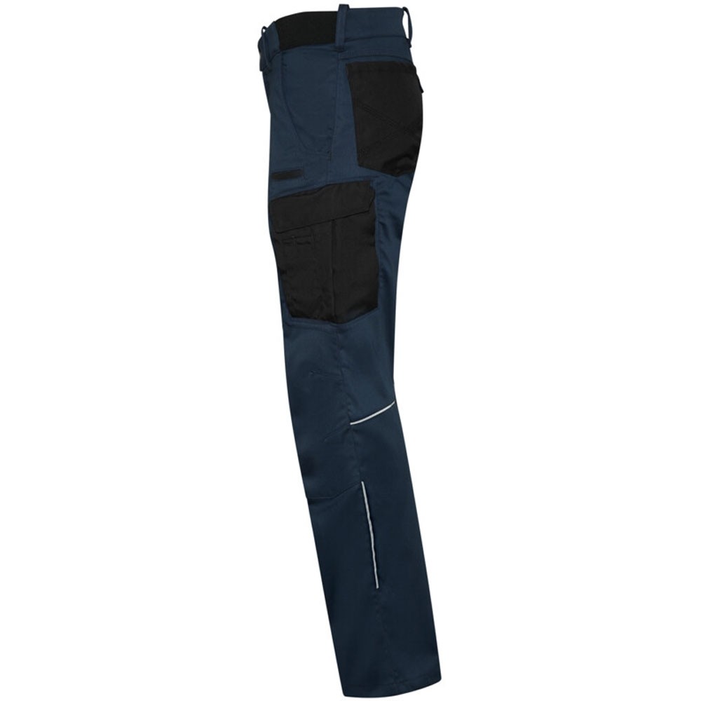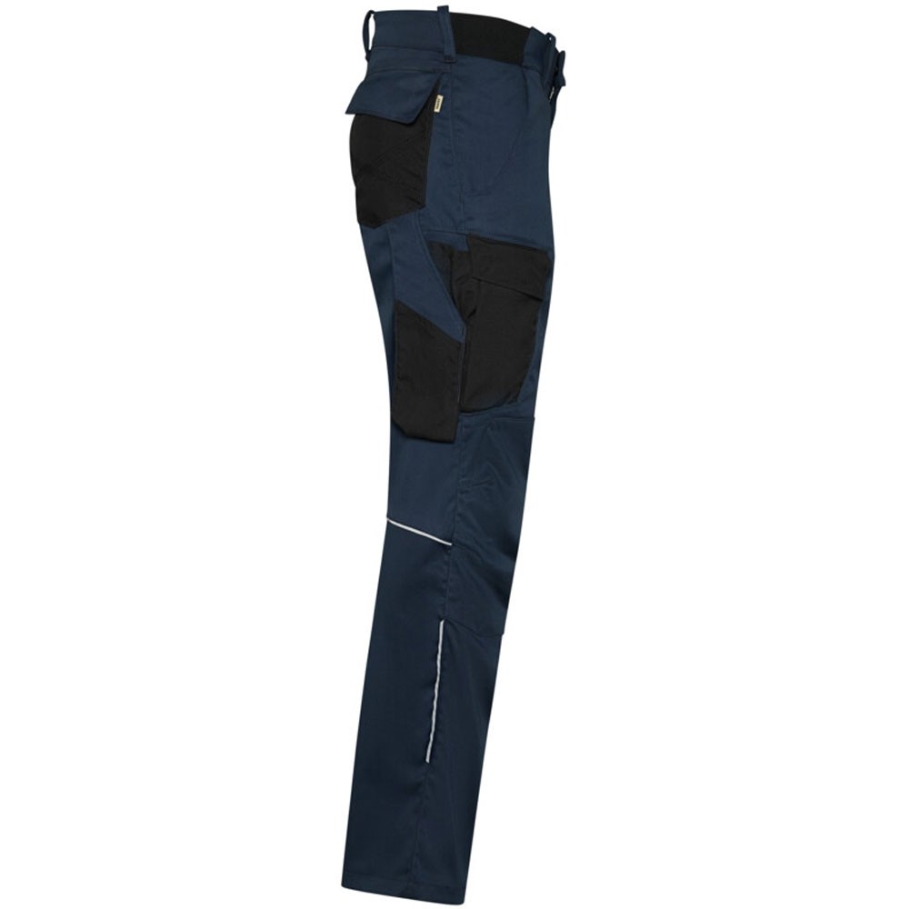 Extrem strapazierfähige und funktionelle Hose mit dehnbarem Hosenbund durch robuste Strickeinsätze an den Seiten. Sicherheitsknopf, Reissverschluss, Gürtelschlaufen, eingenähte Reflexbänder und ergonomisch vorgeformte Passform. Zwei Einschubtaschen, rechts mit zusätzlicher Sicherheits-Reissverschlusstasche. Zwei Gesässtaschen mit Stickerei, rechts mit Patte und Klettverschluss. Zwei Cargotaschen mit multifunktionellen Unterteilungen, verschliessbar mit Patten und Reissverschluss an der linken Cargotasche. Aufgesetzte Zollstocktasche auf der rechten Seite. Alle aufgesetzten Taschen aus CORDURA® und alle Reissverschlüsse von YKK®. Besonders strapazierfähiger Materialmix aus Baumwolle, GRS-zertifiziertem, recyceltem Polyester und Elasthan. Verfügbar auch als Damenmodell.